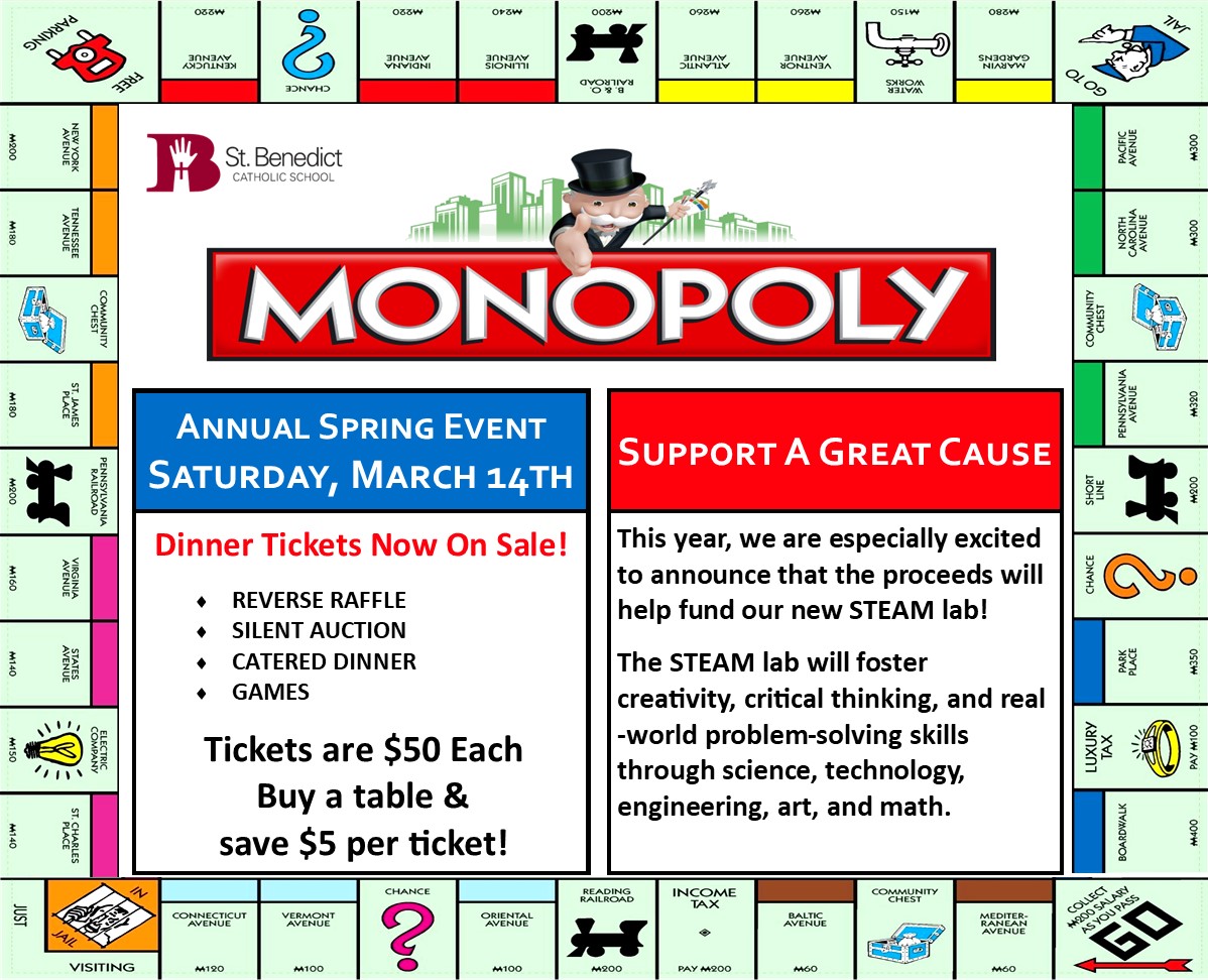 On Saturday, March 14, 2026, St. Benedict Catholic School will host our annual spring event: Monopoly!